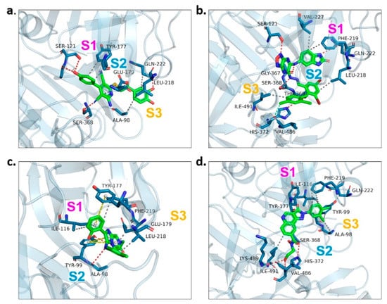 Proteinligand interactions of candidate compounds with PfPMV. (a–d) illustrate the binding of residues with compounds 17, 47, 62 and 147. Candidate compounds were shown in green color. S1, S2 and S3 represent three subpockets. Dashed line in red indicates H-bonds interactions, grey represents t hydrophobic interaction, yellow illustrates pi–pi interaction and blue implies halogen bond interaction.