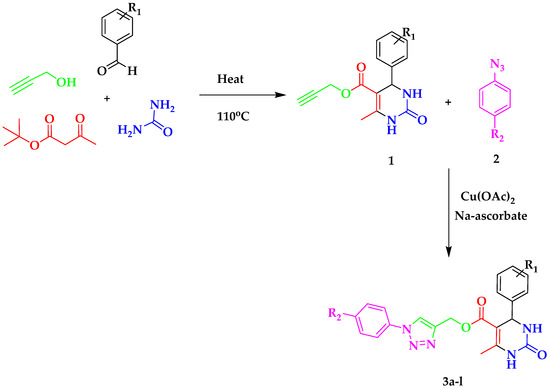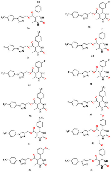 - Venugopala, K.; Dharma Rao, G.B.; Bhandary, S.; Pillay, M.; Chopra, D.; Aldhubiab, B.E.; Attimarad, M.; Alwassil, O.I.; Harsha, S.; Mlisana, K. Design, synthesis, and characterization of (1-(4-aryl)- 1H-1,2,3-triazol-4-yl)methyl, substituted phenyl-6-methyl-2-oxo-1,2,3,4-tetrahydropyrimidine-5-carboxylates against Mycobacterium tuberculosis. Drug Des. Devel. Ther. 2016, 10, 2681–2690. [Google Scholar] [CrossRef]