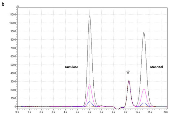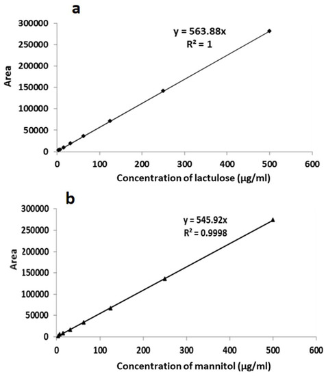 The calibration curves for lactulose (Figure 3a) and mannitol (Figure 3b) were each linear up to 500 µg mL−1 with the following regression equations: lactulose, y = 563.88x; and mannitol, y = 545.92x (expressed as the formula y = a + bx where a = 0 as the line intercepts the axes at 0). The limit of detection (LOD) was up to 4 µg mL−1 for both lactulose and mannitol in the standards.