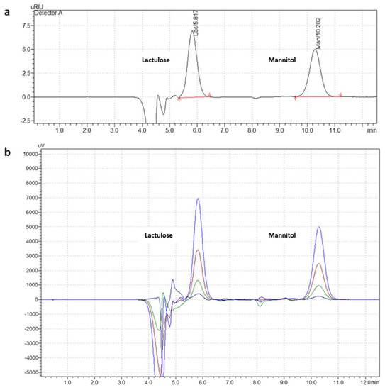 Hitherto, considerations for method development have included an isocratic HPLC system with refractive index detection [27,28,30,40]. This work describes the development of a simple, reproducible, and convenient method for detecting urinary lactulose and mannitol based on HPLC methodology using a resin-based cation exchange column with a refractive index detector and a common, standard, readily available HPLC system. We determined the accuracy, sensitivity, precision, and reproducibility of the method using standard solutions, human urine samples spiked with lactulose and mannitol, and urine from subjects following the oral ingestion of a lactulose (10 g) and mannitol (5 g) solution during a standardized 6 h dual sugar absorption test.