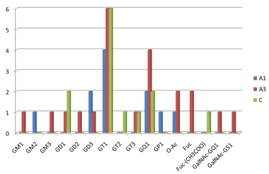 Histogram comparatively plotting the number of ganglioside species in A1, A3, and C vs. their glycan chain composition.