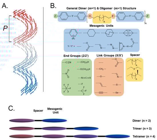 As with all mesophases, the formation of the NTB phase in a given material is intimately linked to molecular structure, and there has been significant effort in the design of new materials that exhibit the NTB phase []. The molecular structure of liquid crystalline dimers can be subdivided into distinct regions, as outlined in Figure 1B. In the simplest terms, a dimer consists of two rigid mesogenic units joined by a flexible spacer [,,]. For a trimer, three mesogenic units are joined in a similar fashion, and so on. Today, in the region of 1000, materials are known to exhibit the NTB phase, and so in this review, we focused on systematic variations to key areas of molecular structure rather than making a futile attempt to cover all materials.