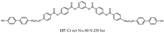 Tamba et al. reported an ether-linked dimer, comprising a bent-core unit as well as a calamitic unit, which exhibited the twist-bend nematic phase as well as an unidentified ‘M2’ mesophase []. Homologues employing other spacer lengths (trimethyleneoxy or hexamethyleneoxy) or a dodecyloxy terminal chain in lieu of the nitrile unit employed in 134 do not exhibit the twist-bend nematic phase. To date, compound 134 (Figure 2), along with those in Table 14, are the only known examples of bent-core materials that exhibit the twist-bend nematic phase, although others have been previously suggested [].
