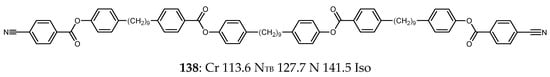 In 2016, Mandle and Goodby reported a methylene linked tetramer comprising phenyl benzoate mesogenic units (Figure 4) [,]. The heliconical tilt angle of the NTB phase of 138 was estimated via the X-ray scattering method, and was found to be comparable to the parent dimer, compound 11 (Table 2) []. The synthetic strategy used to prepare this tetramer was further refined to deliver a twist-bend nematic hexamer, with six mesogenic units connected in a linear manner.