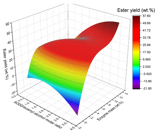 To validate the model, an experimental assay (in triplicate) was carried out under the designed optimal conditions (Risoamyl of 1:2.5, menz of 6.0 wt.%, 45 °C, and stirring at 250 rpm in a shaker incubator) gave a reaction yield of 35.0 ± 2.5 wt.%, while the model Equation (1) predicted a reaction yield of 41.9 ± 6.8 wt.% (a relative error between experimental and predicted value less than 20%). This result shows that the model could satisfactorily predict the real behavior of this complex reaction system.