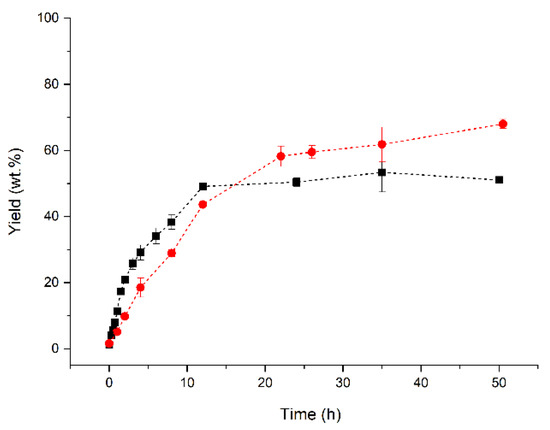 The reaction yield (Y, in wt.%) for each sample was calculated by Equation (2),