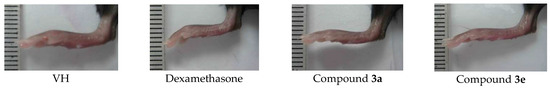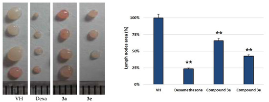 For the in vivo assay of anti-inflammatory activity in mice, two compounds (3a and 3e) were selected based on IL-6 and IL-1β assay data and were evaluated for their effect on draining lymph nodes and on footpad thickness. Zymosan A (3 mg/mL) was injected into the right footpad of the mice [19]. Zymosan A-induced infiltration of inflammatory cells into draining popliteal lymph nodes (pLNs) and caused their mass to increase. Further, edema was observed after the injection into the right footpad. The edema and sizes of pLNs were decreased with the treatment of compounds 3a and 3e (30 mg/kg), as shown in Figure 1 and Figure 2. Compound 3e showed a significant ameliorative effect, which is comparable to dexamethasone treatment. The anti-inflammatory drug dexamethasone was employed as a positive control.