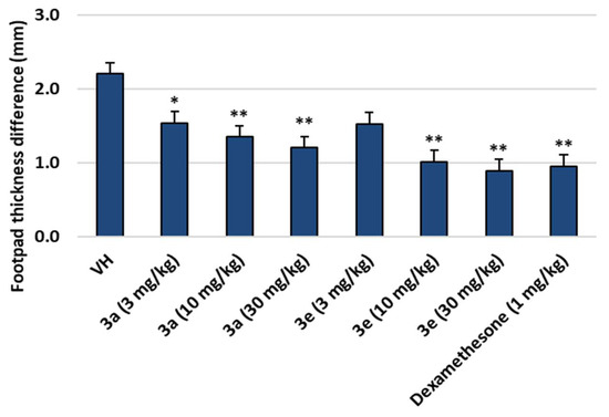 Footpad thickness differences in mice after treatment with compounds 3a and 3e (VH: zymosan A only). Data are presented as the mean ± SD. Student’s t-test was used for comparisons involving two groups. (n = 8). * p < 0.05, ** p < 0.01 vs. VH.