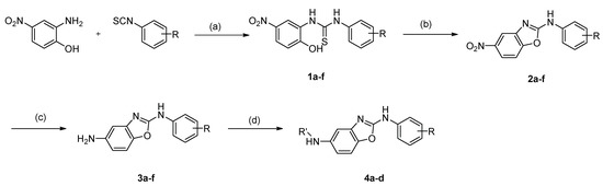 Novel compounds with 2,5-diaminobenzoxazole moiety were synthesized as shown in Scheme 1. Commercially available 2-amino-4-nitrophenol was reacted with variously substituted phenyl isothiocyanates to produce thiourea compounds (1a–f). The thioureas were cyclized with KO2 to obtain benzoxazoles by oxidation (2a–f). The nitro group was reduced to the amino group with tin (II) chloride (3a–f). The amino group was then reacted with various acid chlorides, acid anhydride or formaldehyde to afford the desired amides (4a–d).