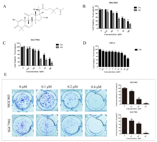 23,24-dihydrocucurbitacin E (DHCE) effectively suppressed the proliferation of gastric cancer cells. (A) Chemical structure of DHCE. (B,C) MTT assay of cell viability in MGC803 and SGC7901 cells treated with DHCE (0–100 μM) for 24 and 48 h, respectively. (D) MTT assay of cell viability in normal gastric epithelial (GES-1) cells treated with DHCE (0–128 μM) for 24 h. (E) Clones in MGC803 and SGC7901 cells treated with DHCE (0, 0.1, 0.2, or 0.4 μM) for 10 days in a colony formation assay and the statistic results of colony formation assays. The experiment was performed in triplicate, and the statistical results are expressed as means ± SD (* p < 0.05 and ** p < 0.01 compared with the control group).