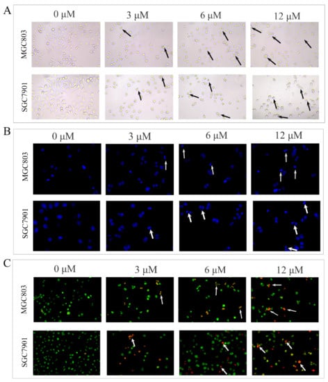 MGC803 and SGC7901 cells were plated into 24-well plates, 1 mL per well, at a density of 3 × 104 cells/mL. After overnight incubation, DHCE of different concentrations (0, 3, 6, or 12 μM) were added and incubated for 24 h; an inverted microscope (Olympus, Tokyo, Japan) was used to observe the cellular morphology. After that, cells were washed with PBS and fixed with 4% paraformaldehyde solution for 20 min, then stained with DAPI for 30 min in the dark. As for AO/EB staining, the cells treated with DHCE under the same conditions were rinsed with PBS and stained in the dark for 5 min. The cellular morphology was observed under a fluorescent inverted microscope (Nikon, Japan).