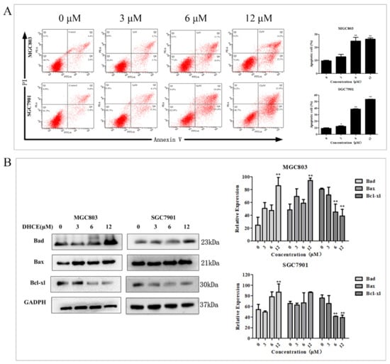 DHCE induced apoptosis of gastric cancer cells. (A) MGC803 and SGC7901 cells were treated with different concentrations of DHCE for 24 h, and the apoptosis level was detected by Annexin V-FITC/PI double staining. (B) Western blot was used to detect the expression levels of Bad, Bax and Bcl-xl in MGC803 and SGC7901 cells. The experiment was performed in triplicate, and the statistical results are expressed as means ± SD (* p < 0.05 and ** p < 0.01 compared with the control group).