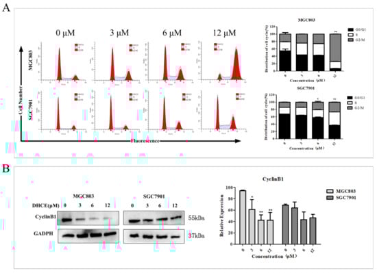 DHCE induced G2/M phase arrest of gastric cancer cells. (A) The distribution of MGC803 and SGC7901 cells at different phases after treatment with DHCE (0, 3, 6, or 12 μM) for 24 h. The experiment was performed in triplicate, and the statistical results are expressed as the means ± SD (* p < 0.05 and ** p < 0.01 compared with the control group). (B) The expression levels of cyclin B1 were detected by Western blot in MGC803 and SGC7901 cells which were treated with DHCE (0, 3, 6, or 12 μM) for 24 h. The experiment was performed in triplicate, and the statistical results are expressed as the means ± SD (* p < 0.05 and ** p < 0.01 compared with the control group).