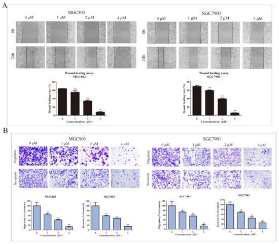 DHCE inhibited migration and invasion of gastric cancer cells. (A) The wound healing assay of MGC803 and SGC7901 cells. After making a linear wound, cells were treated with DHCE (0, 1, 2, or 4 μM) diluted with serum-free RPMI-1640 for 24 h. The photographs were captured at 0 and 24 h under an inverted microscope with a magnification of 100×. The wound area was measured, and the migration potential of each group was quantified. (B) Trans-well migration and invasion assay of MGC803 and SGC7901 cells. Images were photographed using an inverted microscope under a magnification of 200×. The number of invading cells were counted, and the migration and invasion potentials of each group were quantified. The experiment was carried out in triplicate, and the statistical results are expressed as the means ± SD (* p < 0.05 and ** p < 0.01 compared with the control group).