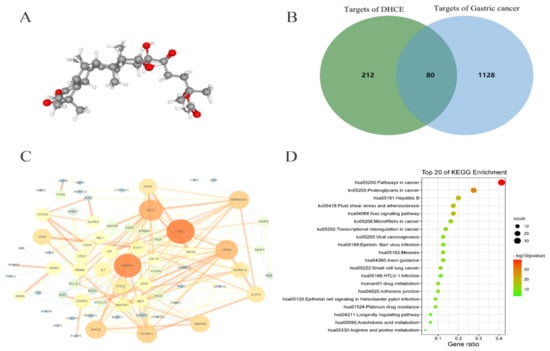 Targets and pathways enrichment analyses. (A) The 3D conformer of DHCE. (B) Venn diagram of 292 DHCE targets (left) and 1208 gastric cancer targets (right). Eighty common targets (middle) between DHCE and gastric cancer were identified as candidate targets for DHCE in the treatment of gastric cancer. (C) The PPI network of the 80 candidate targets. (D) KEGG pathway enrichment analysis of the 80 candidate targets. The size of dots indicates the number of genes in the KEGG pathways.