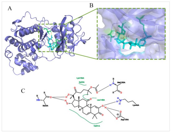 ERK2 was the core predictive target of the PPI network, and it was a key protein of the Ras/Raf/ERK/MMP9 pathway. Therefore, in order to verify the depression effect of DHCE on ERK2 protein, a molecular docking experiment was carried out. The molecular docking experiment was performed via AutoDockTools 1.5.6 and PyMol. The X-ray crystal structure of ERK2 with a resolution of 1.76 Å (Protein Data Bank, 5K4I) were used for docking studies. The greater the negative energy is, the larger the sum of the physical terms representing the combined free energy is. The lower the energy, the better the docking orientation. As shown in Figure 7A, B, DHCE bound to ERK2 at −8.3 Kcal/mol and fit nicely into the hydrophobic pocket to occupy the ATP binding site. Two-dimensional diagrams of DHCE interacting with surrounding residues of ERK2 were exhibited in Figure 7C. The results suggested that Lys106, Leu148, and Val31 had multiple hydrophobic interactions with DHCE, which helped stabilize their binding. DHCE formed a hydrogen bond with Met100 and Lys46, and it formed two hydrogen bonds with Ile23 and Asp159. The formation of hydrogen bonds improved the ability of ligand to target protein and thus better inhibited ERK2 protein. Ile23 is a crucial amino acid, which plays a particular role in stabilizing DHCE–ERK2 binding, supplying both hydrogen bonding and hydrophobic forces. The results of molecular docking suggested that the inhibition of DHCE on ERK2 depended on both hydrogen bonds and hydrophobic forces.