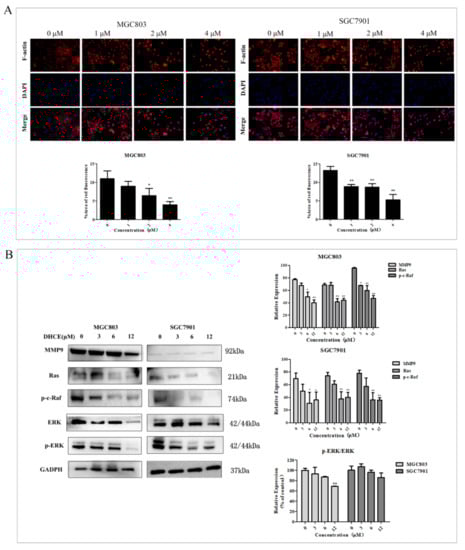 DHCE destroys cytoskeletal organization and attenuates the Ras/Raf/ERK/MMP9 pathway in gastric cancer cells. (A) The expression of F-actin microfilament was measured by Actin-Tracker Red-555 staining. The relative expression of F-actin microfilament was quantified by red fluorescence area. (B) Immunoblot analyses of MMP9, Ras, p-c-Raf, and p-ERK/ERK in MGC803 and SGC7901 cells treated with or without DHCE. The experiment was performed in triplicate, and the statistical results are expressed as the means ± SD (* p < 0.05 and ** p < 0.01 compared with the control group).