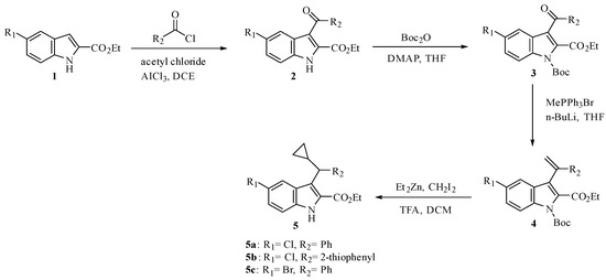 1 reacted with benzoyl chloride for the electrophilic substitution at the C-3 position. Tert-butyloxycarbonyl (Boc) was added to intermediate