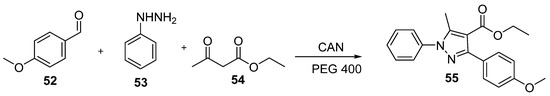 54 were allowed to react in the presence of cerium (IV) ammonium nitrate (CAN) and PEG 400 in a one-pot synthesis. The reaction time and yield were optimized with CAN compared to other catalysts to yield pyrazole derivative