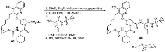 65 was synthesized by linking the amine derivative with quinoline via five steps. The hydroxyl group was protected using