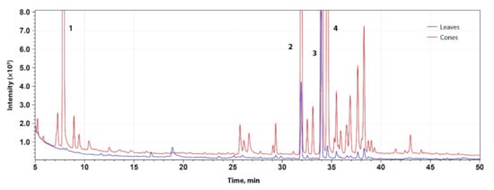 The chromatographic profile perfectly demonstrates that the quantity of volatiles was a few times lower in the leaves than cones, as shown in Figure 1.