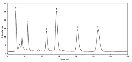 HPLC chromatogram of aqueous 75% methanol extract of cones of ‘Kauno gražieji’ hop variety. (1—compounds that are not retained by reversed phase stationary phase; 2—xanthohumol; 3—cohumulone; 4—humulone; 5—colupulone; 6—lupulone; λ = 348 nm).