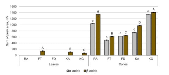 As reported by Kac and Vovk [], the proposed chromatographic method allows the determination of bitter α- and β- acids and their homologues. Along with xanthohumol, bitter α- and β-acids were also identified. It is evident from Figure 3 that aqueous 75% methanol extracts of the leaves of some analyzed varieties contain minimal amounts of bitter β-acids colupulone, and lupulone. Still, there is no α-acids present in the samples of leaves.