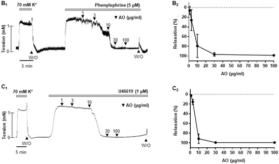 A. officinarum extract-induced vasodilation in rat mesenteric arteries. (A1–C1), data showing responses to cumulative administration of A. officinarum extract (1–100 μg/mL) on high-K+ (A1) or U46619 (B1) or phenylephrine (C1) -induced contraction. (A2–C2), statistical analysis of the relaxation response to A. officinarum extract. Mean ± SD (n = 7). Inset, representative trace showing responses to vehicle, DMSO (0.0005–0.05%). (W/O: wash out; AO: Alpinia officinarum extract).