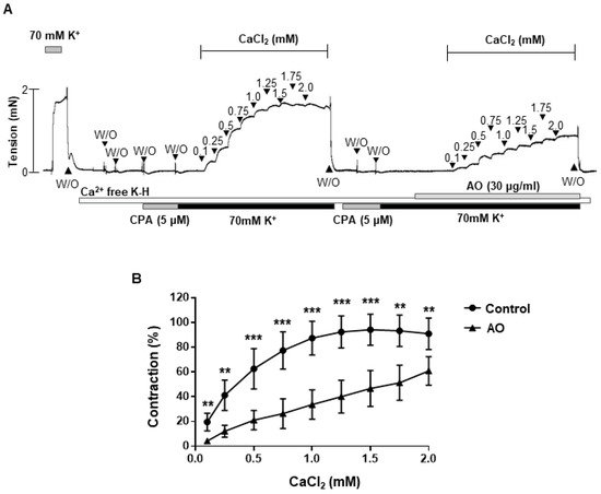 Decrease in Ca2+-induced contraction in A. officinarum extract-treated mesenteric arteries. (A), Representative trace showing the effect of A. officinarum in the mesenteric arteries, treated with cumulative addition of CaCl2 (0.1–2 mM). (B), statistical analysis of contraction induced by CaCl2 in the mesenteric arteries, with or without A. officinarum. Mean ± SD (n = 7). ** p < 0.01, *** p < 0.001 (CPA: cyclopiazonic acid; W/O: wash out; AO: Alpinia officinarum extract).