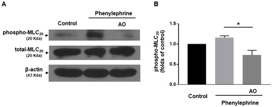 Effect of A. officinarum extract on the phosphorylation of 20 kDa myosin light chain (MLC20). (A), representative Western blot analysis for phosphorylated MLC20 (phospho–MLC20) and total MLC20 (total–MLC20) in control VSMCs, VSMCs treated with phenylephrine (5 µΜ), and VSMCs co-treated with phenylephrine (5 µΜ) and A. officinarum (30 µg/mL). (B). Quantitative data for phosphorylated MLC20. * p < 0.05 (AO: Alpinia officinarum extract).