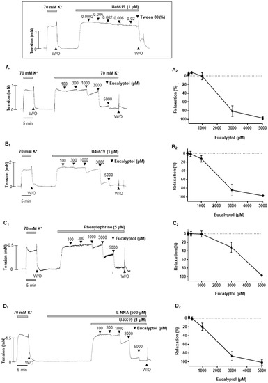 Eucalyptol-induced vasodilation in rat mesenteric resistance arteries. (A1–C1), data showing responses to cumulative administration of eucalyptol (100 µM–5 mM) on high-K+ (A1) or U46619 (B1) or phenylephrine (C1) -induced contraction. (A2–C2), statistical analysis of the relaxation response to eucalyptol. (D1), effect of L-NNA (500 µM) on the eucalyptol-induced vasodilation. (D2), statistical analysis of the relaxation response to eucalyptol in the presence of L-NNA. Inset: representative trace showing responses to vehicle, tween 80 (0.0002–0.02%). Mean ± SD (n = 7). (W/O: wash out).