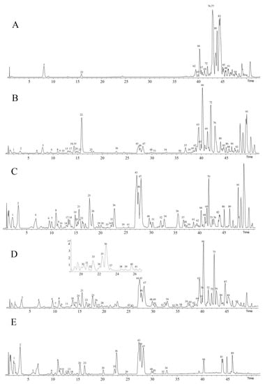 Base peak chromatogram (BPC) of different fractions from the Paris polyphylla var. chinensis leaves (PPL) in positive ion mode. (A). Petroleum ether fraction; (B). chloroform fraction; (C). ethyl acetate fraction; (D). n−butanol fraction; (E). water fraction.