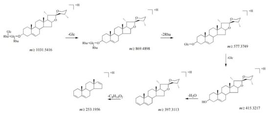 Seven compounds (33, 34, 45–47, 71, and 73) were classified as diosgenin−type saponins. The mass spectra of these compounds indicated the fragmentation ions at m/z 415, 397, and 253 [21,22]. Among them, the content of compound 44 was the highest. Compound 44, the molecular ion of which was located at m/z 1031.5416 ([M + H]+), showed the main fragmentation ions at m/z 869.4898 [M + H − Glc]+, 577.3749 [869.4898 − 2Rha]+, and 415.3219 [577.3749 − Glc]+. The fragmentation ions at m/z 397.3113 and 271.2063 could be formed by successive losses of H2O (18 Da) and C8H16O2 (144 Da). Therefore, compound 44 was identified as pariphyllin A [23]. The fragmentation pathways of compound 44 are proposed in Figure 3. Seven compounds of this type were identified and have been reported previously in PP [23,24].