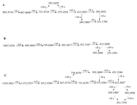 The fragmentation pathways of compounds 64 (A), 40 (B), and 36 (C) in positive ion mode [23,26,29,30,31].