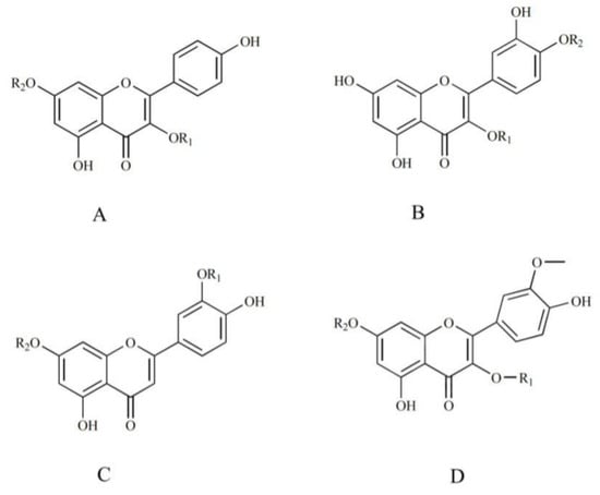 The flavonoid skeletons identified from different parts of PPL in positive ion mode. (A) Kaempferol-type; (B). quercetin-type; (C) luteolin-type; (D) isorhamnetin-type.