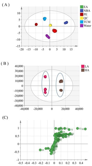 To differentiate the potential substance basis of PPL inhibiting these cancer cells, metabolites were analyzed using multivariate statistical methods. The obtained multivariate dataset was normalized and then analyzed by SIMCA-P. From the score plot, a clear separation of the five fractions was observed (Figure 6). To identify potential compounds targeting cancer cells, data were analyzed using OPLS-DA. According to the MTT test results, the obtained data were divided into two groups, a high-activity group (chloroform and n−butanol fractions) and a low-activity group (petroleum ether, ethyl acetate, and water fractions). The model described 90.0% of the variation in X (R2X = 90.0%), and 98.7% of the variation in Y (class) (R2Y = 98.7%), which predicted 98.5% of the variation in Y (Q2Y = 98.5%). Hence, the model indicated satisfactory classification among these samples (Figure 6B,6C). The variable importance in the projection (VIP) value was used to screen the variables responsible for bioactivity. Compounds satisfying a VIP value > 1 and a p-value < 0.05 are generally considered candidate bioactive compounds. As shown in Table 3, 30 compounds were screened, of which 27 compounds, including steroidal saponins, flavonoids, and ceramides, were highly contained in the high-activity group.