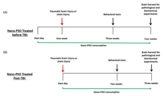 Outline of experiments. (A) Animals were treated with Nano-PSO (1.6% oil/mL) or drinking water for one week prior the exposure to TBI; (B) Animals were treated with Nano-PSO (1.6% oil/mL) or drinking water immediately after exposure to TBI. Both experiments continued consuming Nano-PSO to the end point of each experiment, except the untreated control or TBI group. Behavioral tests were carried out two weeks following TBI for both experiments in separate cohorts of animals.