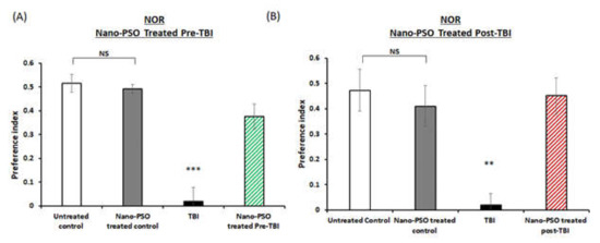 Nano-PSO administration to TBI mice improved spatial memory assessed in the Y-maze test. TBI mice treated or untreated were subjected to the Y maze test at two weeks following TBI as described in the methods: (A) mice treated with Nano-PSO before TBI; and (B) mice treated with Nano-PSO post-TBI represent preference index of the relative time that mice spent exploring the novel arm compared to the old arm. Statistical analysis by One-way ANOVA revealed that TBI animals had a deficit in spatial memory compared to all other groups. (A: F (3, 36) = 16.039, p = 0.000 Fisher’s LSD post hoc, *** p < 0.001, n = 10; B: F (1, 15) = 14.127, p = 0.00 Fisher’s LSD post hoc, ** p < 0.01, n = 10). NS = Not significant. Values are presented as mean ± SEM.