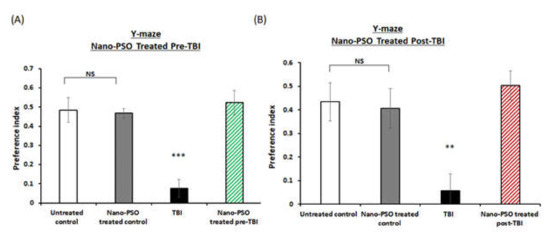 To assess the effects of both of the treatment approaches (pre- or post-TBI) of Nano-PSO consumption on memory formation, the novel object recognition (NOR) and Y-maze paradigms were performed on different groups of mice at two weeks postinjury. The NOR paradigm is consistently reported to be impaired by TBI [25]. As expected, TBI mice suffered from significant visual memory deficits and spent less time near the novel object, compared to all the other groups (p < 0.01, p < 0.001, Figure 2A,B). The deficit was ameliorated by Nano-PSO in both of the treatment approaches. Next, we performed the Y-maze test to evaluate the spatial memory as previously described [26]. At both treatment approaches, TBI mice experienced spatial memory impairment compared to untreated control mice (p < 0.001, Figure 3A,B). When mice consumed the treatment by Nano-PSO, spatial memory impairment was ameliorated in both treatment approaches (p < 0.001).