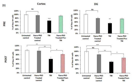 Following the behavioral experiments, which found that Nano-PSO can prevent cognitive damage resulting from brain injury, we looked into the levels of TBI brain damage in the presence or absence of Nano-PSO on cellular levels by immunocytochemistry. Mice were terminated and their brains harvested three weeks post injury, at which time further biochemical changes were found [25,27]. The changes were examined in the temporal cortex, CA3 region of the hippocampus, and dentate gyrus on both sides of the brain. The results from both sides of the brain were combined into one value for each mouse. Figure 4A,B show the immunostaining of these brain areas with anti-NeuN antibody, a marker of mature neurons. The results how that the number of neurons was significantly reduced following TBI, but such reduction in neurons was prevented if Nano-PSO was administrated before TBI or post-TBI and until mice were terminated (three weeks later). TBI induced a decline in the neuronal counts within the cortex and dentate gyrus compared to all other groups (** p < 0.01, *** p < 0.001), indicating a significant neuronal loss at three weeks following the injury (Figure 4A,B). Both of the treatment approaches preserved neuronal counts in the cortex and dentate gyrus. However, preventive treatment further mitigated the neuronal loss in these areas (** p < 0.01, *** p < 0.001) (Figure 4A) compared to the treatment after TBI (* p < 0.05) (Figure 4B).