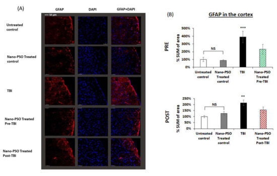 Nano-PSO treatment significantly reduced the elevation of activated astrocytes in the cortex of TBI mice: (A) Coronal sections through the temporal cortex of brains from treated and untreated controls, as well as from untreated TBI, treated with Nano-PSO before TBI and treated with Nano-PSO Post-TBI were immunostained for GFAP (red) and DAPI (blue) [scale bar 50 µm]; (B) Quantitative assessment of GFAP immunostaining for all sections (bregma temporal cortex -1.06nm) at the end point of each experiment was quantified using One-way ANOVA ((PRE: F (3, 8) = 7.741, p = 0.000 Fisher’s LSD post hoc, *** p < 0.001, n = 3) (POST: F (3, 16) = 6.679, p = 0.001 Fisher’s LSD post hoc, ** p < 0.01, n = 5)). NS = Not significant. Values are presented as mean ± SEM.