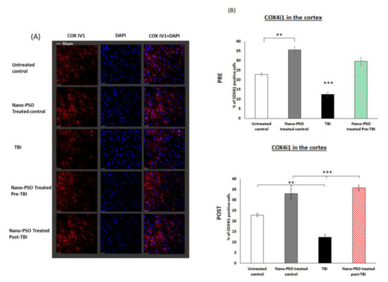 It was shown previously that in spontaneous/genetic models of neurodegenerative diseases, such as AD and CJD, the expression of COX IV1, an important mitochondrial enzyme for energy production in cells, is drastically reduced and replaced by COX IV2, which can function under high levels of ROS [24,30]. However, this is a temporary effect until such levels of ROS finally result in apoptosis and cell death. Nano-PSO administration reduces ROS levels and restores COX IV1expression [30]. Therefore, in this work, we tested if this is also the case for TBI, an outside injury caused to normal mice. To this effect, we immunostained brain slices as described above with COX IV1 antibody. Figure 6 shows that, as was the case for the genetic diseases, TBI also causes a reduction in the levels of COX IV1 even three weeks after infliction of the damage in brains. In this case, and as shown before [30,31], the administration of Nano-PSO increases COX IV1 levels both in the control and in the pre- and post-TBI mice. Since an increase in COX IV1 levels reflects the oxidative status of cells, we conclude that Nano-PSO can also reduce ROS levels in control mice and not only in the TBI-affected mice.