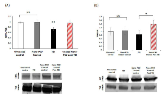 The Immunoblot of the total levels of SIRT1, a marker for NAD-dependent deacetylase sirtuin-1 in the cortex, was examined for all mice three weeks post-TBI (Figure 7). A reduction of SIRT1 levels was found. These results are in line with a previous study with a mild TBI model from our lab [32]. However, this reduction was prevented with Nano-PSO when it was administrated immediately for several weeks after the event.