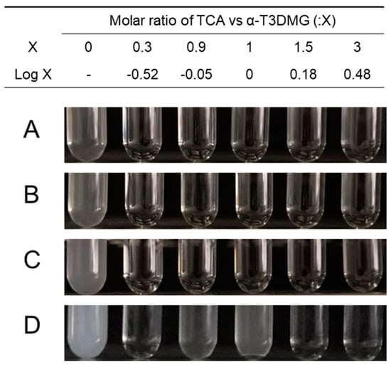 | Molar Ratio of TCA vs. α-T3DMG (X). | logX | pH | Z-Average (nm) | PDI | Z-Potential (mV) |