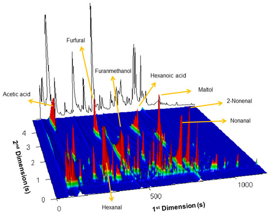 Eleven broas (B1 to B11) prepared from eleven traditional maize varieties and one broa (B12) prepared from commercial hybrid maize flour were studied (Table S1 and Figure S2) [27]. A contour plot of the total ion current chromatogram of a broa sample (B1) under study is presented in Figure 2. In a first approach, the presence of volatiles belonging to the chemical families mostly associated with baking was identified in the chromatograms of all studied samples (n = 12). A total number of 128 volatile compounds belonging to these families were detected and are described in Table 1. More than 80% of the compounds have been identified according to the criteria described in Section 3.3.