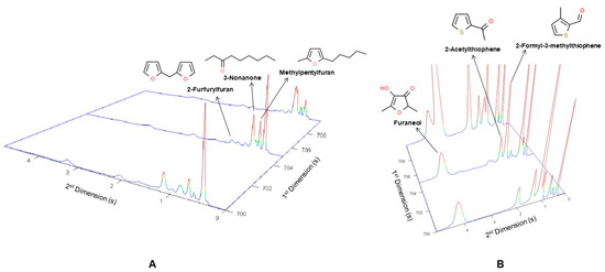 Another example is the identification of methylpentylfuran (F27). This compound was not commonly detected in foods but was previously tentatively identified in broas by GC-MS [27]. The results obtained in the present work corroborate this earlier identification. The mass spectrum of F27 showed a high similarity index with the spectra from methylpentylfuran from the Wiley database (Table 1). Furthermore, this compound showed a very low retention time of 0.50 s in the 2D column (Figure 4), suggesting its low polarity, which was confirmed by its calculated Log P of 4.43. Although methylpentylfuran usually refers to 3-methyl-2-pentylfuran, F27 can also correspond to other isomers, such as 2-methyl-5-pentylfuran or 4-methyl-2-pentylfuran. In addition, several other volatiles belonging to chemical families, which usually arise during baking, were eluted at this 1tR (705 s), namely furfurylfuran (F28), 2-formyl-3-methylthiophene (Tp4), 2-acetylthiophene (Tp5) and furaneol (Fo20). Since they show different polarities (Log P of 2.52, 1.38, 1.28 and –0.33, respectively), they were separated through the 2D column (2tR: 0.95, 1.31, 1.56 and 4.02, respectively). As shown in Figure 4A, the peak intensities of methylpentylfuran (F27) and 3-nonanone were much higher than F28, Tp4, Tp5 and Fo20. Thus, it would not have been possible to identify these compounds without the orthogonal separation through the 2D column [64,65]. The identification of volatile sulfur compounds (Figure 4B) is particularly relevant since they are typically present in foods at extremely low levels, often at sub-parts-per-billion concentrations, but provide background sensory nuances to the flavor and are often considered “character-impact compounds” [13].