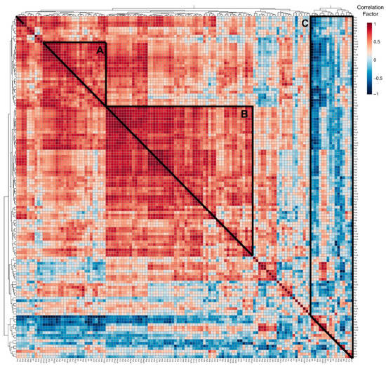 Correlation heatmap of the 128 volatile compounds in broas. The correlation coefficients of volatiles are represented through a chromatic scale from deep blue (−1), corresponding to negative correlations, to red (1), corresponding to positive correlations. The letters correspond to volatiles that (A) strongly contributed to differentiating the samples along PC2; (B) strongly contributed to differentiating the samples along PC1 and (C) negatively contributed to PC1 and PC2.