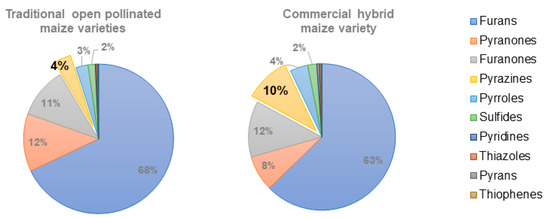 Representation of the percentage of chromatogram area for the families of chemical compounds studied in broas prepared from traditional maize varieties (n = 11) and commercial maize flour.