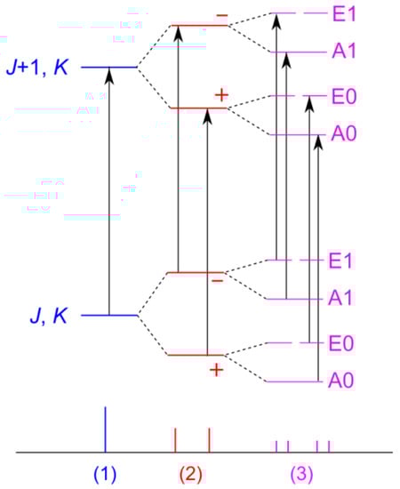 Non-scaled energy levels and microwave signal splittings for different types of molecules. (1) Asymmetric rigid rotor (e.g., phenetole []), (2) One two-fold tunneling motion (e.g., phenyl formate with the tunneling of the phenyl ring []), (3) One two-fold tunneling motion and a methyl internal rotation (e.g., phenyl acetate with the tunneling of the phenyl ring and the internal rotation of the acetyl methyl group, this work). Rotational a-type transitions are indicated as black arrows. Please note that, for sake of simplicity, the symmetric top J, K label is used to indicate the rotational levels, rather than the correct J, Ka, Kc one.