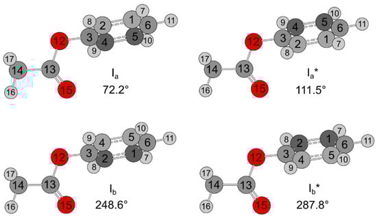Four minima equivalent in energy at E = −458.9579885 Eh of the most stable conformer I (entgegen) of phenyl acetate with C1-symmetry. The geometries were fully optimized at the MP2/6-311++G(d,p) level of theory. The dihedral angle β = ∠(C3-O12-C13-C14) describes the entgegen orientation of the acetyl group and is 180°, while α = ∠(C13-O12-C3-C2) corresponds to the orientation of the phenyl ring, which is 72.2° for Ia, 111.5° for Ia*, 248.6° for Ib, and 287.8° for Ib*. Note that α ≈ 90° or 270° at the transition states, corresponding to a tunneling angle of about 40° from one minimum to the other.